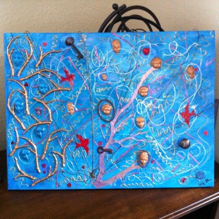 She delivered the piece to me earlier today so I can deliver it to the JDRF office. It will be hard to let the piece go. I was nearly brought to tears when I opened the door to find my own fear, anger, hope, love and journey staring back at me. When I look at the piece I see the blue for diabetes awareness, and red for the blood my kids shed multiple times each day. I see sadness, anger and fear in the faces that are tangled in the weeds to the left – struggling. I see the birds of hope releasing those struggling to be connected with others fighting the same battle. I see the love. I see the keys that will set us all free and unlock the cure. Like I said I will be sad to relinquish this symbol of hope to the JDRF but I have no doubt it will help raise money that will lead to unlocking the door to the cure.