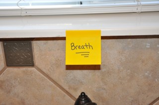 This note is on the window sill above my kitchen sink. In addition to eating when I am emotional I also clean (a healthy choice but not as tasty). I have shed many tears over a sink full of suds. Sometimes I forget to breath – this is a helpful reminder.