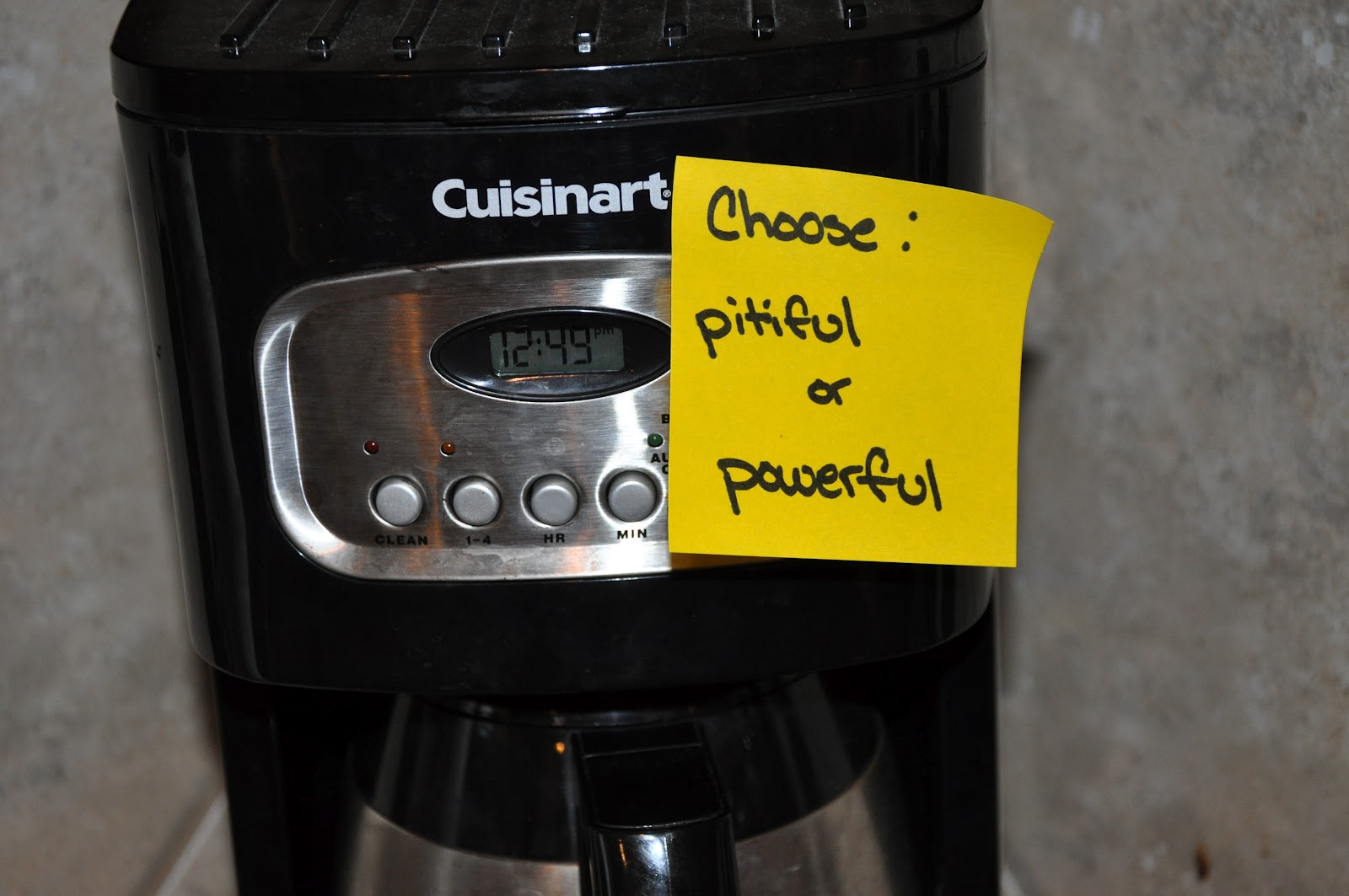 I’ve mentioned this one before during my favorite quotes post. The first thing I do is make coffee each moring – before waking my kids up. I’m NOT a morning person but since listening to Mike Lawson on Blog Talk Radio and reading his blog I have been much better at being a morning person. Although I do admit I have to put effort into choosing powerful vs. pitiful for the first hour of my day.