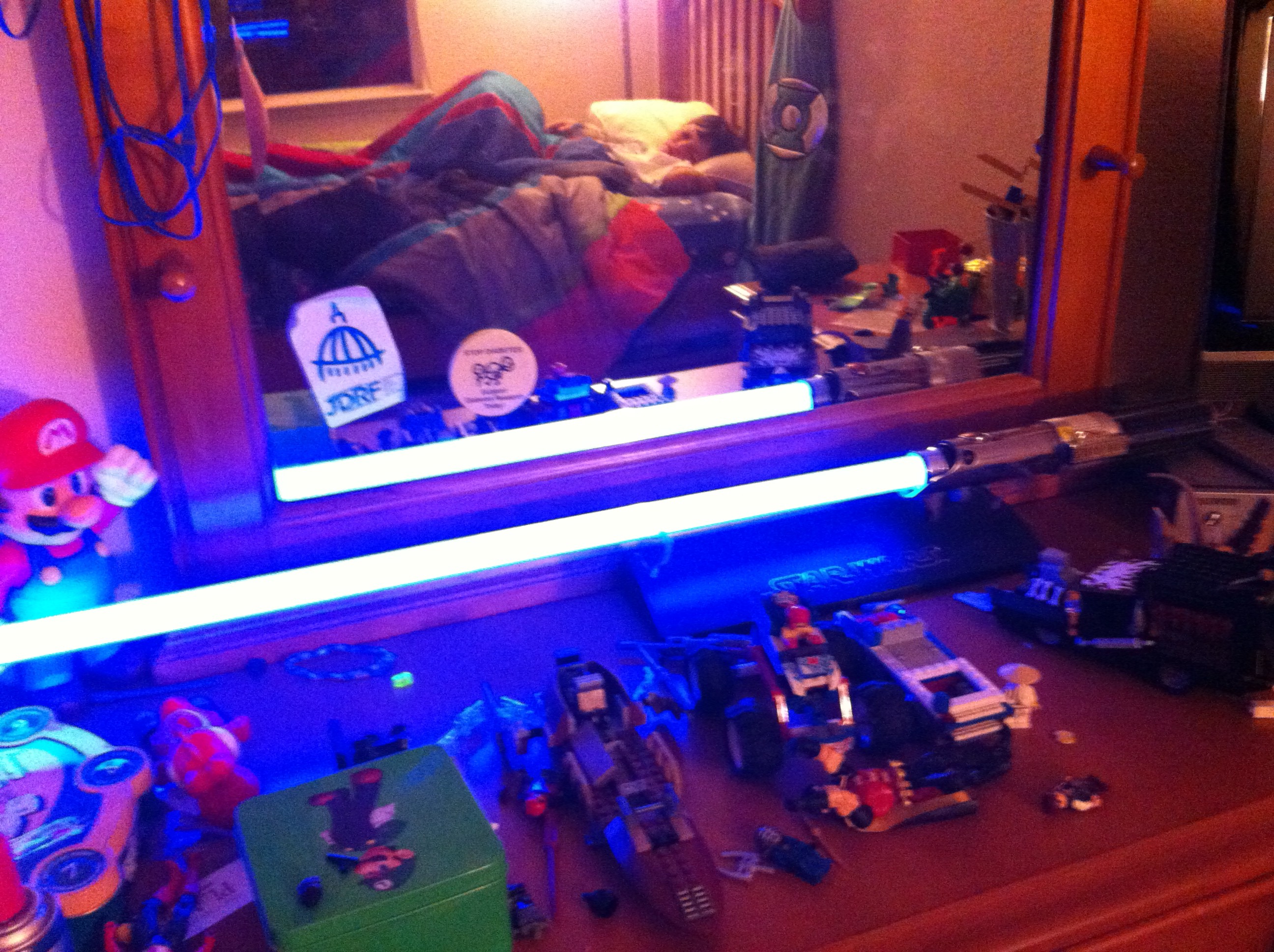 Yes it was an authentic replica of a Star Wars lightsaber. It was a Christmas gift the prior Christmas. It is exceptionally bright and makes the coolest and most realistic lightsaber sounds. I turned it on and heard the ‘whoosh’ sound so familiar to any Star Wars fan or mother of young kids. I wielded it through the room as whooshing and swooshing sounds echoed around me. It provided the light I needed to test his blood sugar which was behaving well. I turned to find my reflection in his dresser mirror. Sporting my bubble gum jammy pants and cami, hair disheveled and face puffy from waking at 3am – yet I stood there waving my Jedi weapon feeling incredibly powerful.