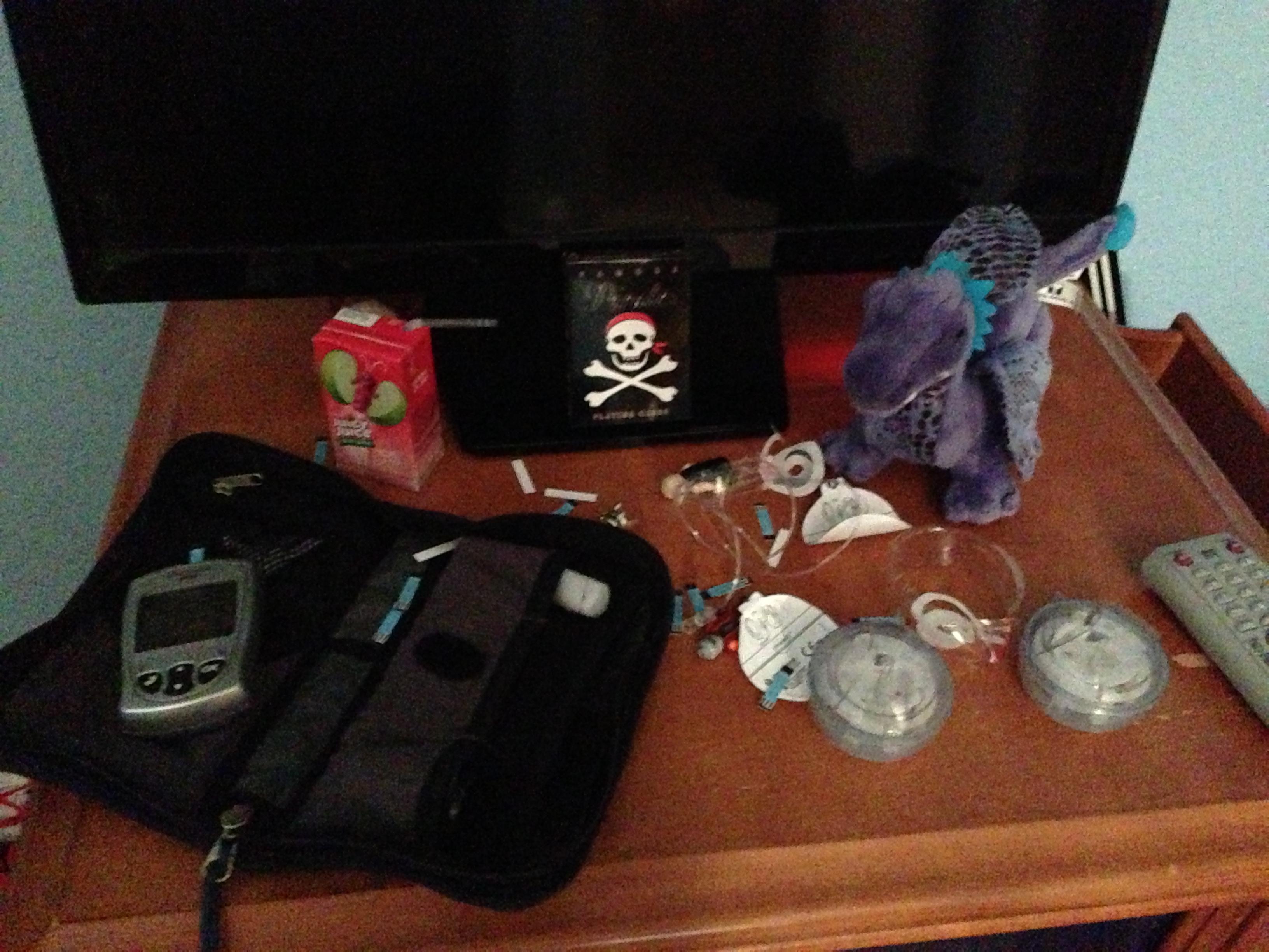 Sometimes the insulin corrections drop the kids too fast. Other times the corrections don’t make a dent in the high numbers and the kids will require an infusion set change (place where the tubing from the insulin pump is attached to their bodies). An infusion set change means another dose of insulin and 2 more hours of waiting (check, dose, wait, repeat). If the kids dropped too low it means giving them fast acting carbs (normally a juice) while they sleep and another hour of waiting.